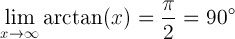 The limit of arctangent of x when x is approaching infinity is equal to pi/2 radians or 90 degrees: